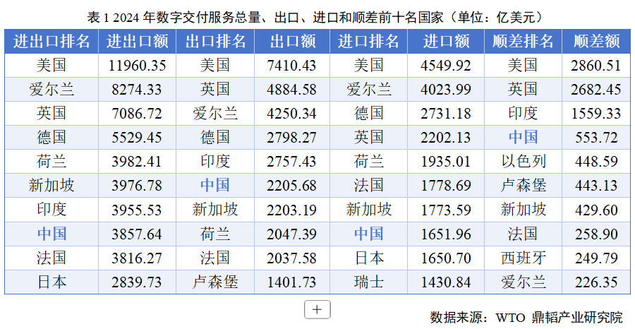 近年来,中国数字交付贸易实现显著增长,成为全球服务贸易格局中不可忽视的力量。2005至2024年间,中国数字交付服务进出口总额从401.27亿美元跃升至3857.64亿美元,复合年均增长率达12.65%,增速远超全球平均水平。2024年,中国数字交付服务出口规模位列全球第六,顺差规模跻身全球第四,展现出强劲的国际竞争力。在结构上,其他商业服务与ICT服务共同占据超过四分之三的贸易份额,成为顺差扩张的核心驱动力;同时,离岸服务外包的蓬勃发展进一步夯实了数字交付出口的基础。然而,知识产权领域持续存在的逆差,也折射出中国在高端技术引入与自主创新之间的平衡与挑战。在本篇观点中,鼎韬系统梳理了中国数字交付贸易的发展情况与主要特征,探寻其背后的动力与未来方向。