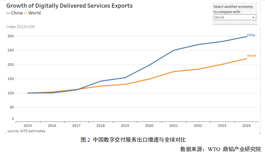 ①中国数字交付服务出口份额不断提升,增速全球领先