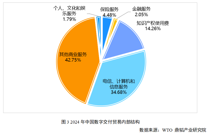 2024年,中国数字交付贸易顺差项主要来源为ICT服务(572.19亿美元)和其他商业服务(462.92亿美元),金融服务也存在4.18亿美元的顺差;逆差项则主要来源于知识产权使用费(344.40亿美元)和保险服务(117.26亿美元)以及人、文化和娱乐服务(23.92亿美元)。