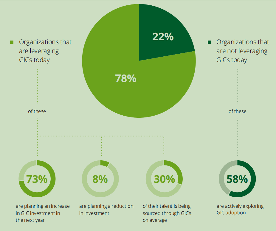 经过近四十年的发展,离岸外包已经从简单的后台支持功能转型为推动技术创新和提升组织效率的关键枢纽。而随着碎片化的全球外包市场环境的形成和发展,安全越来越成为发包国关键的焦点,跨国发包商希望在继续充分利用全球人力资本的同时,控制服务过程的风险,这就推动了从传统将服务外包给离岸服务商的离岸外包模式,向自建离岸服务中心,即全球内包中心(Global Insourcing Centers,GICs,也可称为Global capability centers)模式的转变。