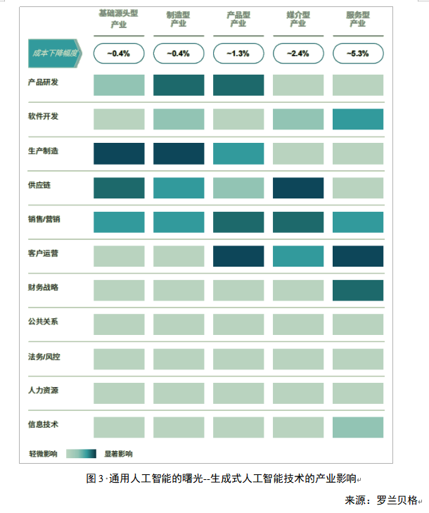 在成本降低角度,罗兰贝格发现生成式人工智能技术将降低中国跨境服务行业5.3%的成本,对各细分行业的成本影响介于1.8%到11.3%之间,其中专业服务、金融服务等知识密集型行业将受到较大的影响。