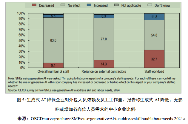 另一方面,也有6.3%的中小企业表示生成式AI增加了对外包商的依赖,这是因为部分企业通过外包服务来充分利用这项新技术(例如为公司定制平台或寻求合规建议)。使用生成式AI处理复杂任务的中小企业,其对外包商依赖度上升的比例(11.7%)是处理简单任务的(4.5%)的两倍多,这一数据支持了上述假设。