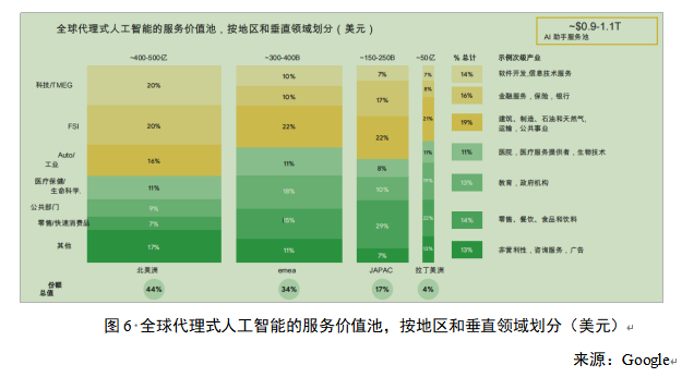 与此同时,人工智能又为全球跨境服务带来了全新的市场增量。Google预测能动型AI服务(咨询、实施与运维)将为全球带来约为1万亿美元的增量市场规模,其中仅美国就达3500亿至4500亿美元,已显著超过当前美国约3200亿美元的传统IT服务支出。结构上,科技与TMEG、金融与保险、零售与消费品、医疗与生命科学以及公共部门是五大主战场,单一垂直的系统集成服务机会普遍在1000亿至2000亿美元区间,北美占全球约四成,EMEA与JAPAC合计接近五成。