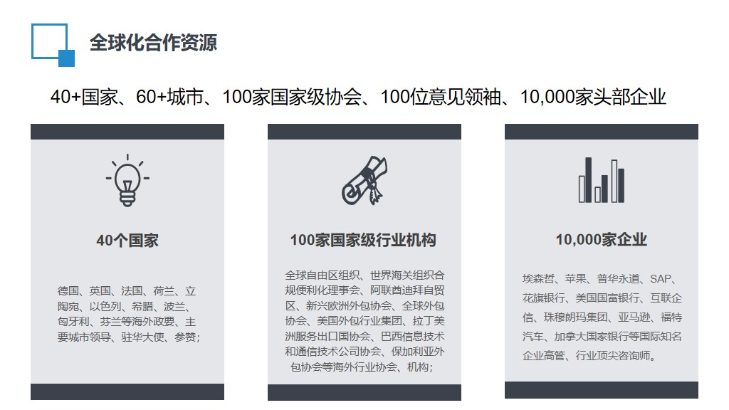 依托强大的全球产业资源及业务网络,鼎韬携手多家国际战略合作伙伴,通过信息共享及合作交流的模式,整合全球服务贸易(服务外包)相关资源及要素,为致力于推动国际服务贸易与外包发展的地区搭建重要渠道,为企业拓展国际业务提供专业的服务及直接通道。