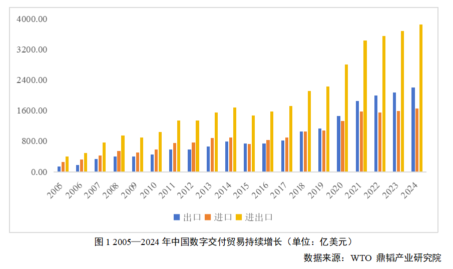 近年来,中国数字交付贸易实现显著增长,成为全球服务贸易格局中不可忽视的力量。2005至2024年间,中国数字交付服务进出口总额从401.27亿美元跃升至3857.64亿美元,复合年均增长率达12.65%,增速远超全球平均水平。2024年,中国数字交付服务出口规模位列全球第六,顺差规模跻身全球第四,展现出强劲的国际竞争力。在结构上,其他商业服务与ICT服务共同占据超过四分之三的贸易份额,成为顺差扩张的核心驱动力;同时,离岸服务外包的蓬勃发展进一步夯实了数字交付出口的基础。然而,知识产权领域持续存在的逆差,也折射出中国在高端技术引入与自主创新之间的平衡与挑战。在本篇观点中,鼎韬系统梳理了中国数字交付贸易的发展情况与主要特征,探寻其背后的动力与未来方向。