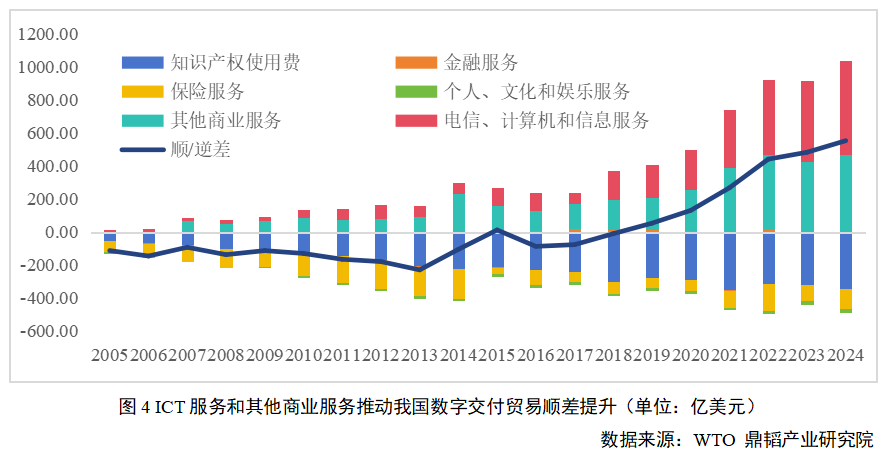 2024年,中国数字交付贸易顺差项主要来源为ICT服务(572.19亿美元)和其他商业服务(462.92亿美元),金融服务也存在4.18亿美元的顺差;逆差项则主要来源于知识产权使用费(344.40亿美元)和保险服务(117.26亿美元)以及人、文化和娱乐服务(23.92亿美元)。