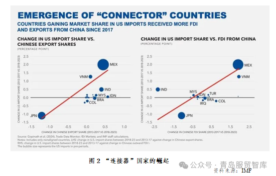 “连接器”国家的概念源于国际货币基金组织(IMF)的一项研究。根据IMF对一些“非结盟国家”(尚未与美国或中国签署自由贸易协定的国家,如墨西哥、越南、印度、马来西亚、印度尼西亚、巴西、哥伦比亚、土耳其、伊拉克和日本等)对中美进出口和接受投资情况的变化的研究表示:自2017年以来,“连接器”国家不仅对美国的出口份额有所增长,还吸引了更多的外国直接投资和来自中国的出口。越南、墨西哥等国在扩大从中国进口的同时,也增加了对美国的出口,显示出它们作为中美贸易“桥梁”的角色。此外,来自中国的对外直接投资也倾向于流向这些国家,进一步增强了它们在美国市场的竞争力。