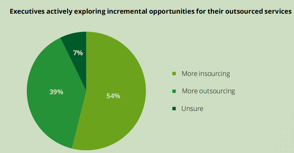 《经济学人》在其《2023年全球贸易转型报告》中指出“自我们2021年开始调查以来,近岸外包或区域化外包的比例增长了8个百分点,回流(reshoring)则增长了10个百分点。”全球排名前十的外包公司HCLTech的首席执行官Srinivasan Seshadri则指出,“最近全球化形势的变化使得离岸外包对公司的吸引力进一步降低。去全球化趋势最明显的影响是企业急需开发本地市场,拉近与客户的距离,并将服务、人才和业务通过回流和近岸外包重新布局。最重要的是,回流和近岸外包将获得社会和政府的支持,同时简化合规性。”