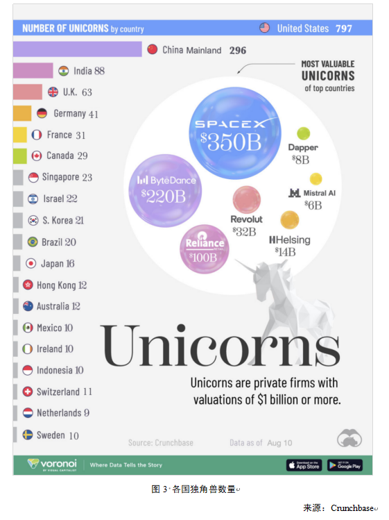 中美两国的独角兽公司总数达到了1093家,约占全球1604家独角兽总数的三分之二,充分显示了两国在全球创新和风险投资领域的绝对领导地位。美国作为无可争议的全球创新中心,以797家独角兽的数量遥遥领先,是全球创新和风险投资的中心。孕育了SpaceX(全球第一)和OpenAI(全球第二)这样的超级巨兽。中国(大陆282、香港13及台湾1)合计有296家,稳居第二,在人工智能、电子商务和金融科技等领域拥有众多巨头。虽然数量上与美国存在差距,但头部企业体量巨大,字节跳动(全球第三)与蚂蚁集团(全球第四)依旧是全球估值最高的独角兽之一,呈现出“数量少但体量大”的特点。