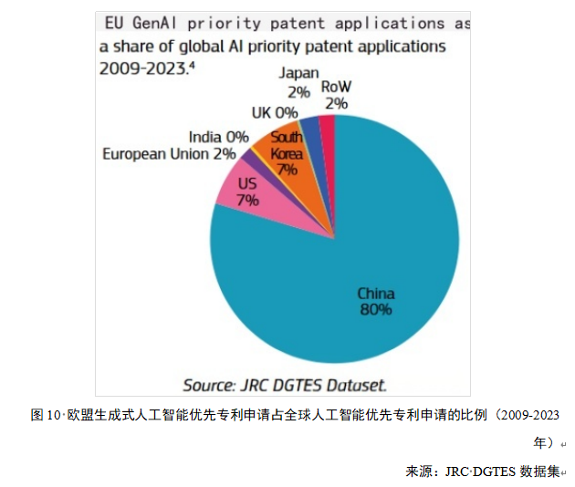 在过去十年生成式AI专利呈指数级增长,到2024年累计专利申请量已超12万项。在2009—2023年期间的全球AI优先专利申请中,中国的占比极高,达到了80%,这显示出中国在通用AI领域的创新活动以及专利申请方面占据主导地位。美国和韩国的占比相同,均为7%,表明这两个国家在该领域也具有较强的创新能力和专利布局。相比之下,日本、世界其他地区以及欧盟的占比均只有2%,而英国和印度为0。