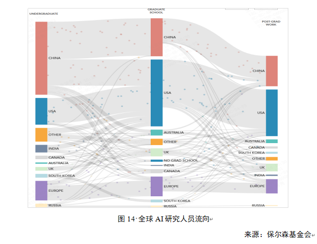 保尔森研究所(Paulson Institute)2020年发布的《全球AI人才追踪报告》(Global AI Talent Tracker)数据显示675名顶尖研究人员中59%就职于美国机构,相比之下,中国机构占11%,欧洲机构占10%。在本科毕业于中国的研究人员中,56%在美国机构学习或工作,37%在中国机构。而在所有就职于美国机构的研究人员中,31%的本科学位授予自美国,其次是中国(27%),欧洲和印度各占11%。