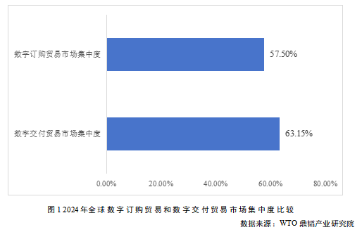 2024年,全球数字订购贸易规模前十名国家合计占比57.50%,数字交付贸易规模前十名国家合计占比达63.15%,几乎为全球数字交付贸易规模的三分之二。可以看出,数字订购贸易的市场集中度相对较低,但也反映出数字订购贸易的贸易普惠度和全球参与度更高等特点。