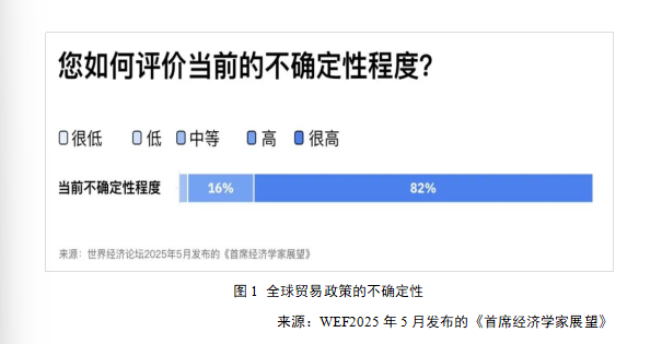 全球贸易政策的不确定性突破了历史高点,成为全球经济发展中不可忽视的重要因素。WEF发布的《首席经济学家展望》定期对各行业的首席经济学家进行调查,以评估他们对全球经济不确定性的感知程度。在2025年5月发布的报告中,82%的首席经济学家表示,当前的不确定性水平非常高。这可能会对贸易量、GDP增长和外国直接投资水平产生不利影响。9月发布的《首席经济学家展望》则进一步指出,全球经济已进入“高度不确定性的新时代”,有97%的经济学家将贸易政策视作全球最大变数。不确定性已演变为一个独立的经济变量,正显著左右着人们的各类抉择。
