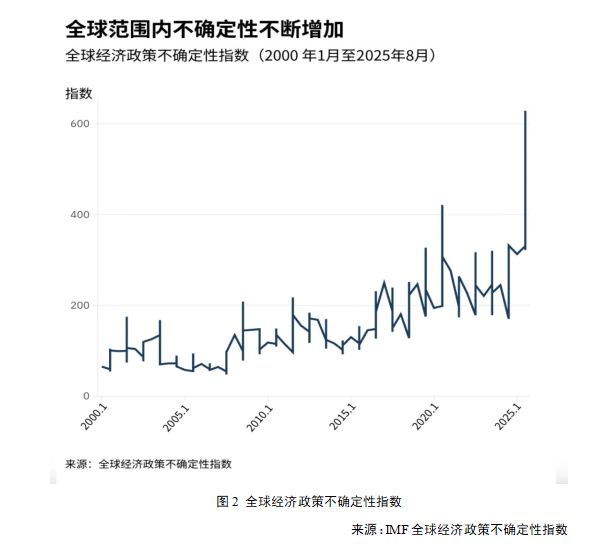 保护主义抬头和贸易争端增多已经导致全球范围内关税和贸易壁垒显著增加。全球贸易预警组织(GTA)的数据,新出现的有害干预政策数量从2017年的600项增加到了2022—2024年的每年超过3000项。仅在2025年前10个月,全球就实施了2500多项贸易限制措施,几乎是2015年同期的5倍。2020年代的全球贸易政策不确定性的平均水平截至目前几乎是2000年代的5倍。