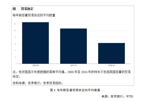 多边贸易体系本身正面临严重压力。世界贸易组织的争端解决机制仍处于瘫痪状态,推进更广泛改革的进展已放慢速度。对深度贸易协定的兴趣已然减弱:在2020年至2024年期间,每年仅签署贸易协定6个左右,签署速度不及2000年代的一半。