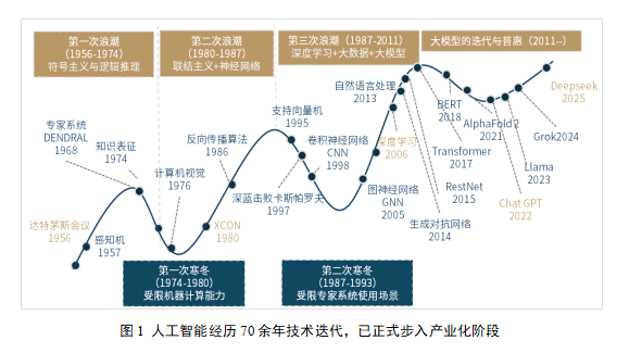 自1956年达特茅斯会议提出“人工智能”概念以来,历经70余年技术迭代,借助机器学习创新、计算能力提升及海量数据支撑,AI从概念走向实践。2017年谷歌发布Transformer架构、2022年ChatGPT面世,标志着强人工智能拐点出现,全球数字经济迈入AI革命时代。