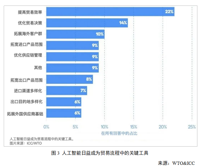 WTO与ICC联合调研发现,近90%的企业报告称其贸易相关活动从AI应用中获益。具体来看,22%的企业提升了效率与生产力,14%的企业决策质量得到改善,10%的企业扩大了出口规模,17%的企业丰富了进出口产品种类。调查还显示,人工智能在帮助企业应对复杂贸易规则、更好利用贸易协定方面潜力巨大。四分之三的受访者表示企业将人工智能应用于各类海关相关事务,20%的受访者称运用人工智能识别贸易合规风险。这一现象表明,人工智能可通过改善市场情报获取渠道、提供贸易合规工具、普及优惠贸易协定知识等方式,推动贸易参与更具包容性,助力缩小人工智能应用差距。