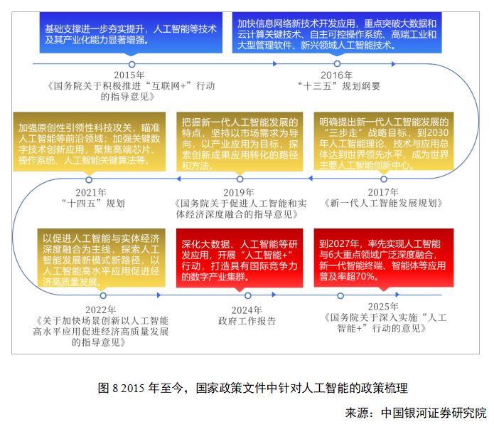中国:人工智能+。在一系列重要指引下,人工智能在中国自2015年起被纳入国家层面政策文件中。从2015年到2025年,从“互联网+”到“AI+”,随着国务院发布《关于深入实施“人工智能+”行动的意见》的发布,我国已将人工智能提升至国家战略高度。文件把人工智能发展提升到“重塑人类生产生活范式,促进生产力革命性跃迁和生产关系深层次变革,形成人机协同、跨界融合、共创分享的智能经济和智能社会新形态”的战略高度。