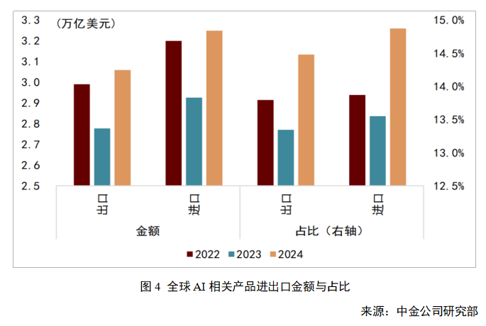 AI对全球贸易的推动作用具有长期性和结构性特点。2023年全球AI赋能商品贸易额已达2.3万亿美元,半导体、数据中心设备等核心输入品的跨境流动成为关键支撑。2024年全球AI相关产品出口3.1万亿美元,较2023年上升10.1%;占整体出口比重为14.5%,较2023年上升1.2个百分点。