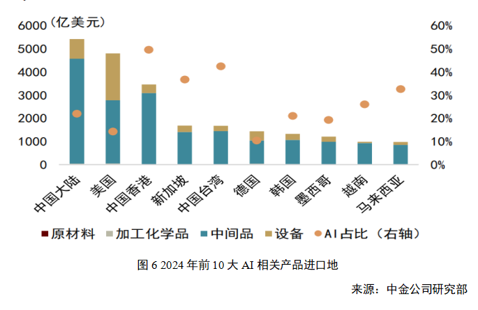 从进口地区分布来看,中国大陆(5413亿美元)、美国(4795亿美元)、中国香港(3460亿美元)排名前三。然而,2024年AI相关设备进口中,美国排名第一,为2016亿美元。
