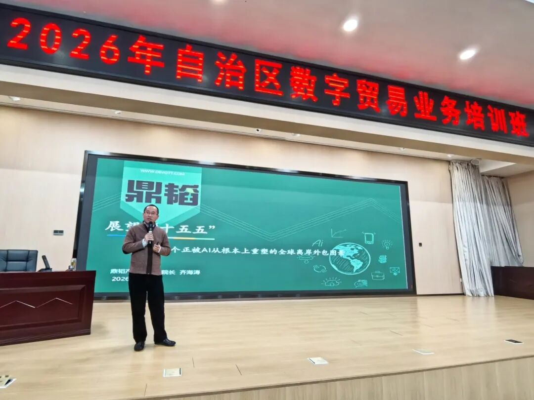 2026年3月12日,鼎韬产业研究院院长齐海涛应邀出席新疆维吾尔自治区商务厅在乌鲁木齐举办的“自治区数字贸易业务培训班”,以“服务外包发展与实践”为主题开展专题授课,为新疆数字贸易领域干部及企业从业人员系统讲授前沿理念与实践经验,助力边疆地区抢抓“十五五”发展新机遇,精准把握服务外包产业变革趋势,推动数字贸易高质量发展。