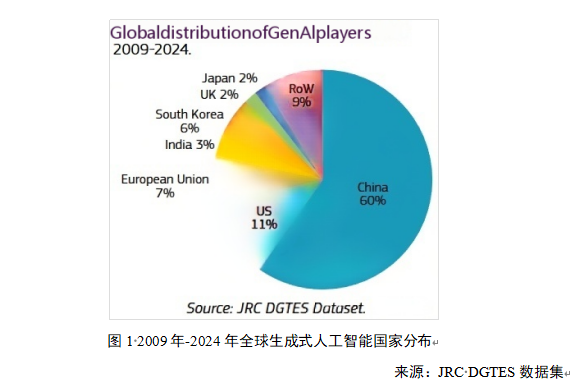 全球目前已有超过7.2万个参与者开展了超过14.9万项GenAI相关活动。就参与者数量和活动规模而言,中国以最高份额领跑,其次是美国。根据欧盟联合研究中心(JRC DGTES)数据集,韩国紧随欧盟之后,占全球的6%,英国和日本各自占全球的2%。值得注意的是,尽管中国在GenAI玩家数量上领先,但美国仍保持着全球商业创新和部署的中心地位。