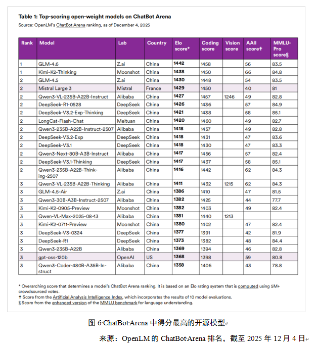在ChatBot Arena这一知名众包评分平台上,中国开放权重模型占据主导地位,在前25名高分模型中,中国5家机构的23款模型成功入围,仅有法国Mistral的一款模型与美国OpenAI的gpt-oss-120b跻身其中。