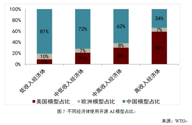 由于中美AI发展比较优势的不同,中国AI相关服务或以更低的单位使用成本在发展中经济体取得更多竞争优势。根据WTO的研究,低收入经济体使用开源AI模型中来自中国的占比为81%,而来自美国的占比仅为9%;高收入经济体使用开源AI模型中来自中国的占比为34%,而来自美国的占比为59%。