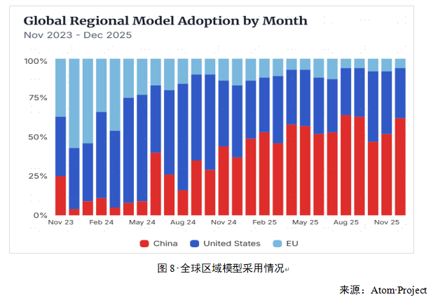 根据Atom Project的统计,截至2025年12月有超过62%的模型衍生品基于中国大模型,超过美国的32%。