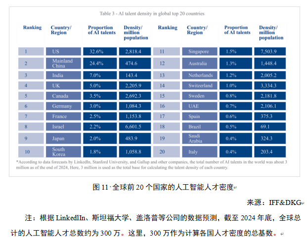 据国际金融论坛(IFF)和深度知识集团(DKG)合作发布的最新全球人工智能报告,以拥有人工智能专业人才数量计,美国和中国遥遥领先,稳居前两位。排名前五的国家依次为美国(32.6%)、中国(24.4%)、印度(7.0%)、英国(5.0%)与加拿大(3.5%)。