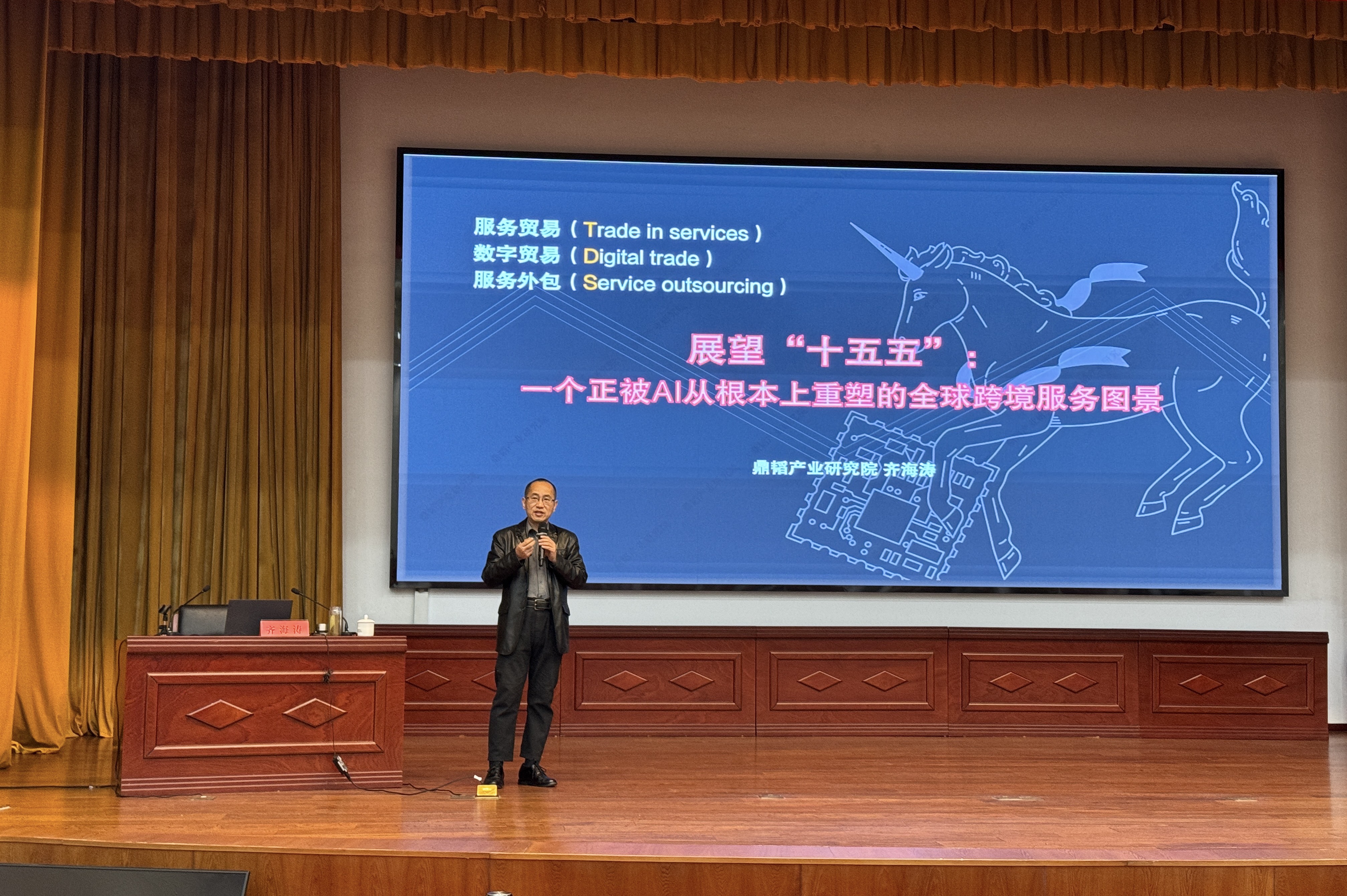 结合当前全球经济进入“高度不确定性新时代”的背景,齐海涛院长分析了全球贸易面临的“黑洞化环境、丛林化秩序、碎片化市场、区块化规则、壁垒化政策、主权化治理”等六大挑战,同时强调人工智能已成为不确定环境中的唯一确定性。他引用WTO、UNCTAD等国际组织报告数据,说明AI通过降低贸易成本、提升全要素生产率、增强服务可贸易性三大机制,正推动全球贸易规模持续扩张。