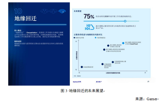 Garner最新发布的《2026年十大战略技术趋势》中,第八个趋势是地缘回迁。当企业感知到地缘政治风险时,往往会将大量数据和应用,从全球公有云迁移至本土化、自主可控的“主权云”上。何为地理化战略(Geopatriation)?该战略指将业务负载从全球超大规模云迁移至主权或本地化环境,以降低地缘政治风险。具体策略包括:将业务迁移至主权云区域,或在本地部署业务负载。为何此趋势日益显著?地缘政治动荡与监管要求正促使企业重新评估云服务依赖度。到2030年,75%的企业将实现工作负载地理化。