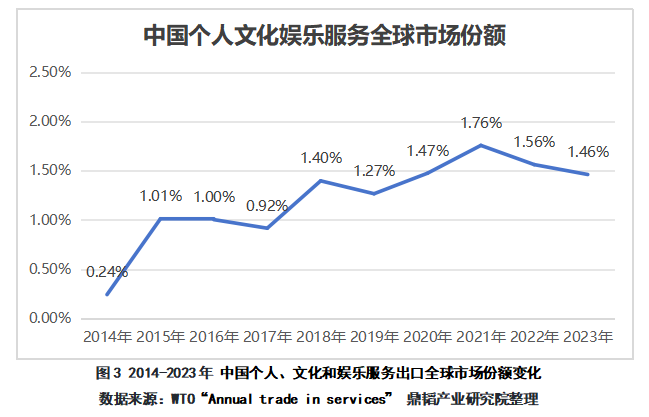 中国个人、文化和娱乐服务出口的全球市场份额较低,近十年基本维持在1%~2%之间,但增长迅猛,从2014年的0.24%上升到2023年的1.46%,九年时间市场份额增长了5.08倍,1.22个百分点。