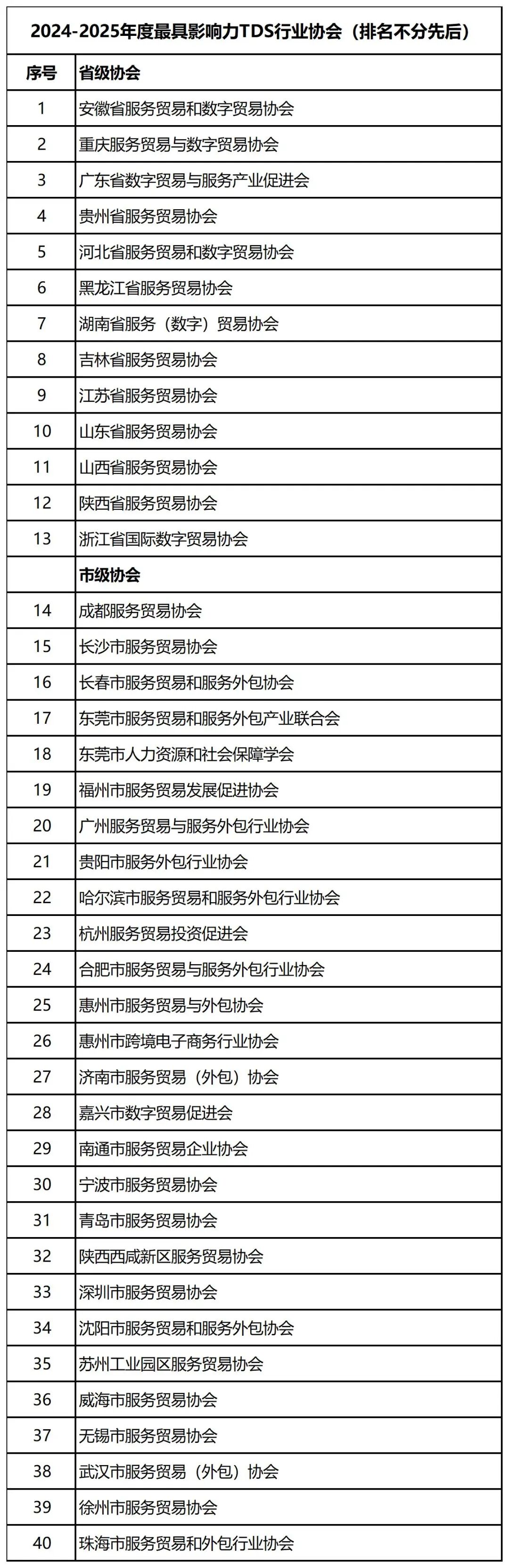 在当今全球化和数字化的经济格局下,服务贸易、服务外包和数字贸易相互关联、协同发展,成为推动经济增长和创新的重要动力。近年来,各地TDS行业协会根据国家相关政策和城市产业发展的需要,为企业和政府部门搭建公共信息沟通交流的平台,提供业务咨询、资源共享、项目培训等服务,组织开展国际国内合作、技术考察和市场开拓等活动,为优化当地服务贸易、服务外包、数字贸易营商环境,促进企业做大做强,全面提升服务贸易、服务外包、数字贸易竞争力,推动服务贸易、服务外包和数字贸易的协同发展做出了贡献。鼎韬研究团队经过系统调研与专业评估,最终推出“2024-2025年度最具影响力TDS行业协会”研究报告。