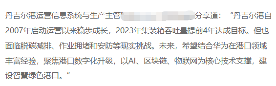 摩洛哥丹吉尔地中海港的代表在会上表达了与华为合作推进港口数字化的意愿,希望借助人工智能、区块链和物联网等核心技术,打造一座智能绿色港口。