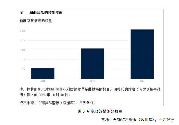 保护主义抬头和贸易争端增多已经导致全球范围内关税和贸易壁垒显著增加。全球贸易预警组织(GTA)的数据,新出现的有害干预政策数量从2017年的600项增加到了2022—2024年的每年超过3000项。仅在2025年前10个月,全球就实施了2500多项贸易限制措施,几乎是2015年同期的5倍。2020年代的全球贸易政策不确定性的平均水平截至目前几乎是2000年代的5倍。
