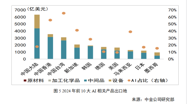 从进口地区分布来看,中国大陆(5413亿美元)、美国(4795亿美元)、中国香港(3460亿美元)排名前三。然而,2024年AI相关设备进口中,美国排名第一,为2016亿美元。