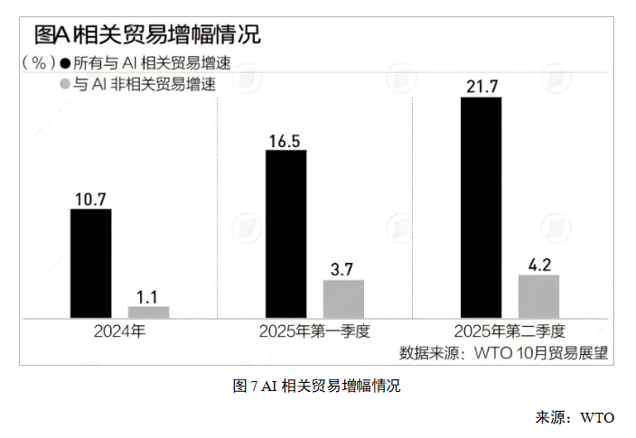 AI相关商品贸易在2025年上半年持续强劲增长。其中,今年第一季度AI相关商品的贸易增速为16.5%,第二季度增至21.7%;同期非AI相关商品的贸易增速仅分别为3.7%和4.2%。